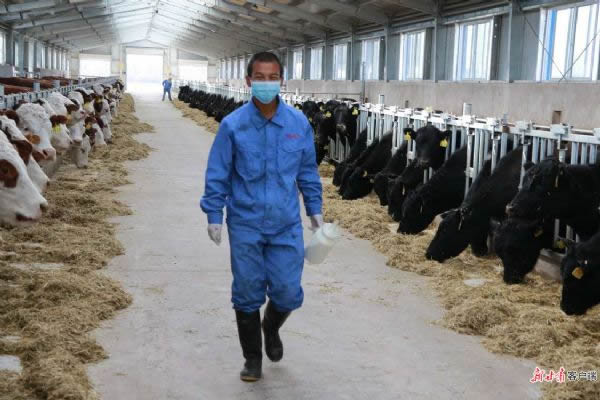 在甘肅農(nóng)墾飲馬牧業(yè)公司,18名黨員在生產(chǎn)一線奮戰(zhàn),牛群活動情況監(jiān)測、飼料投喂、糞污清理等,每個崗位上大家一絲不茍地工作。