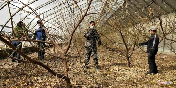 在永昌農(nóng)場的溫室大棚內(nèi),工作人員正在修剪油桃樹枝,讓每株樹冠保持一定形狀和大小,樹體結(jié)構(gòu)合理,枝條疏密得當,便于生長管理。12座大棚共計1200多棵樹,預計20日前完成修剪。農(nóng)場及早聯(lián)系農(nóng)資調(diào)運,為油桃提前上市做好準備。