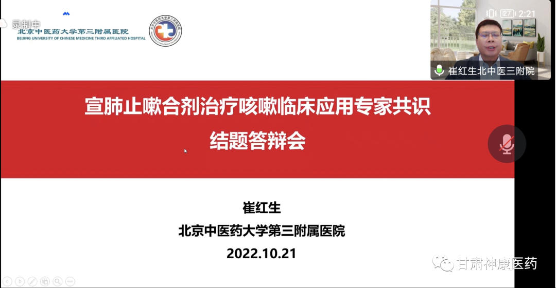 2022年10月21日下午,由中華中醫藥學會主辦,甘肅省普安制藥股份有限公司、北京康眾時代承辦的《宣肺止嗽合劑治療咳嗽臨床應用專家共識》結題答辯會于線上舉行。中華中醫藥學會標準化辦公室負責人蘇祥飛主任,北京中醫藥大學第三附屬醫院王成祥院長、北京中醫藥大學第三附屬醫院崔紅生教授、中日友好醫院楊道文教授、河南中醫大學第一附屬醫院劉向哲教授等專家學者出席會議,會議由蘇祥飛主任主持。