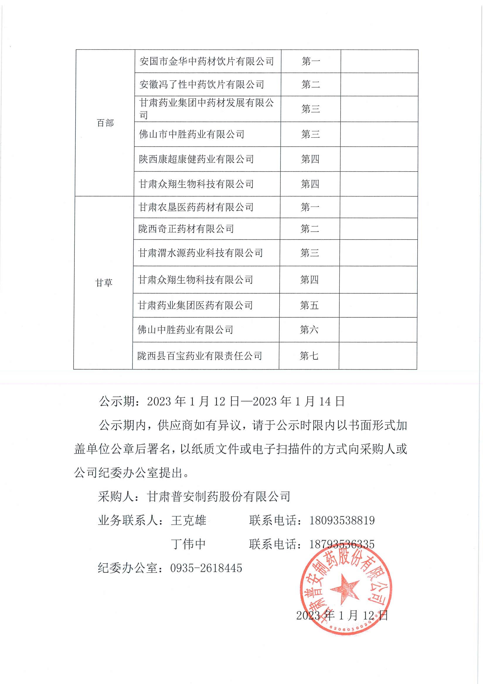 甘肅普安制藥股份有限公司2023年1月中藥材競(jìng)爭(zhēng)性談判結(jié)果公示
