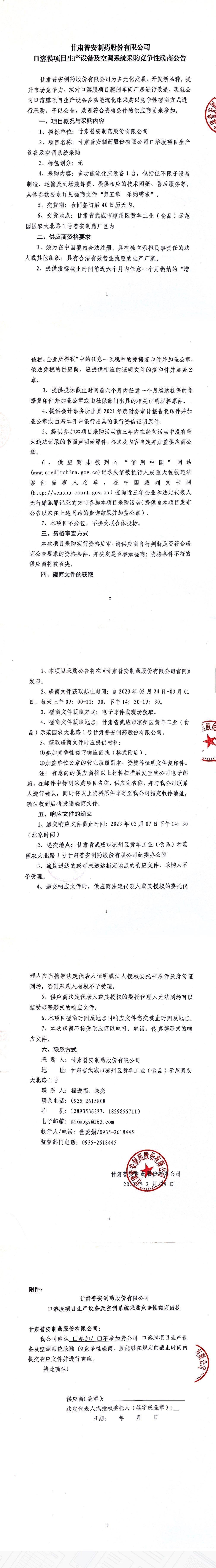 甘肅普安制藥股份有限公司口溶膜項目生產設備及空調系統采購競爭性磋商公告