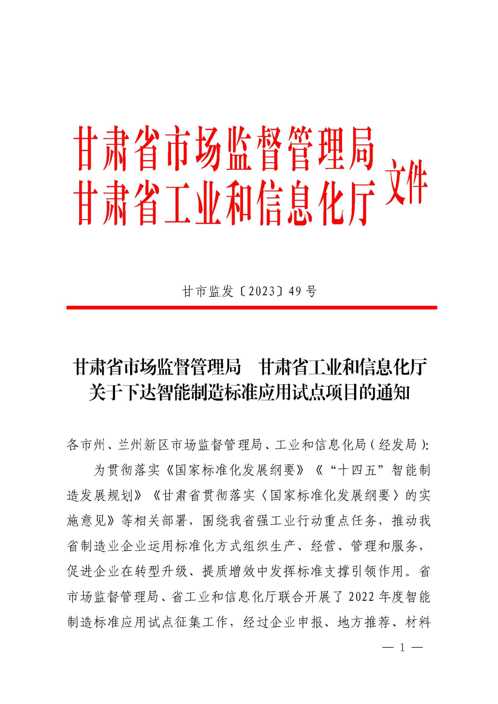 近日,甘肅省市場監督管理局、甘肅省工業和信息化廳公布了省級智能制造標準應用試點項目名單。