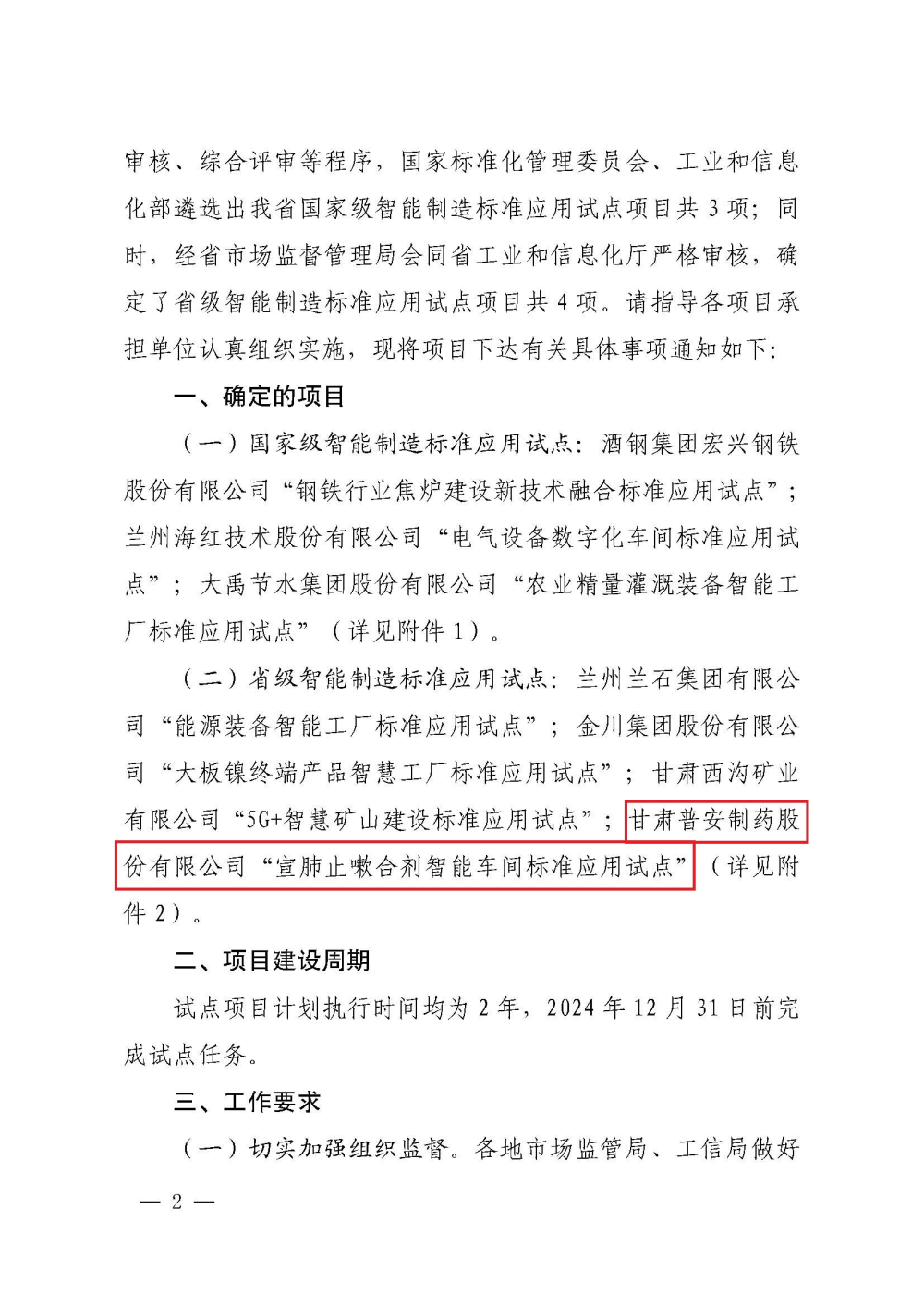 甘肅藥業集團普安制藥《宣肺止嗽合劑智能車間標準應用試點》順利通過省市場監督管理局和省工業和信息化廳嚴格審核,成功入圍省級智能制造標準應用試點項目名單。此次獲批的項目是武威市唯一一個省級智能制造標準應用試點項目,也是公司貫徹“抓執行促落實、抓效能促發展”的又一新突破點,從而實現了甘肅藥業集團普安制藥2023年度標準化工作的開門紅。