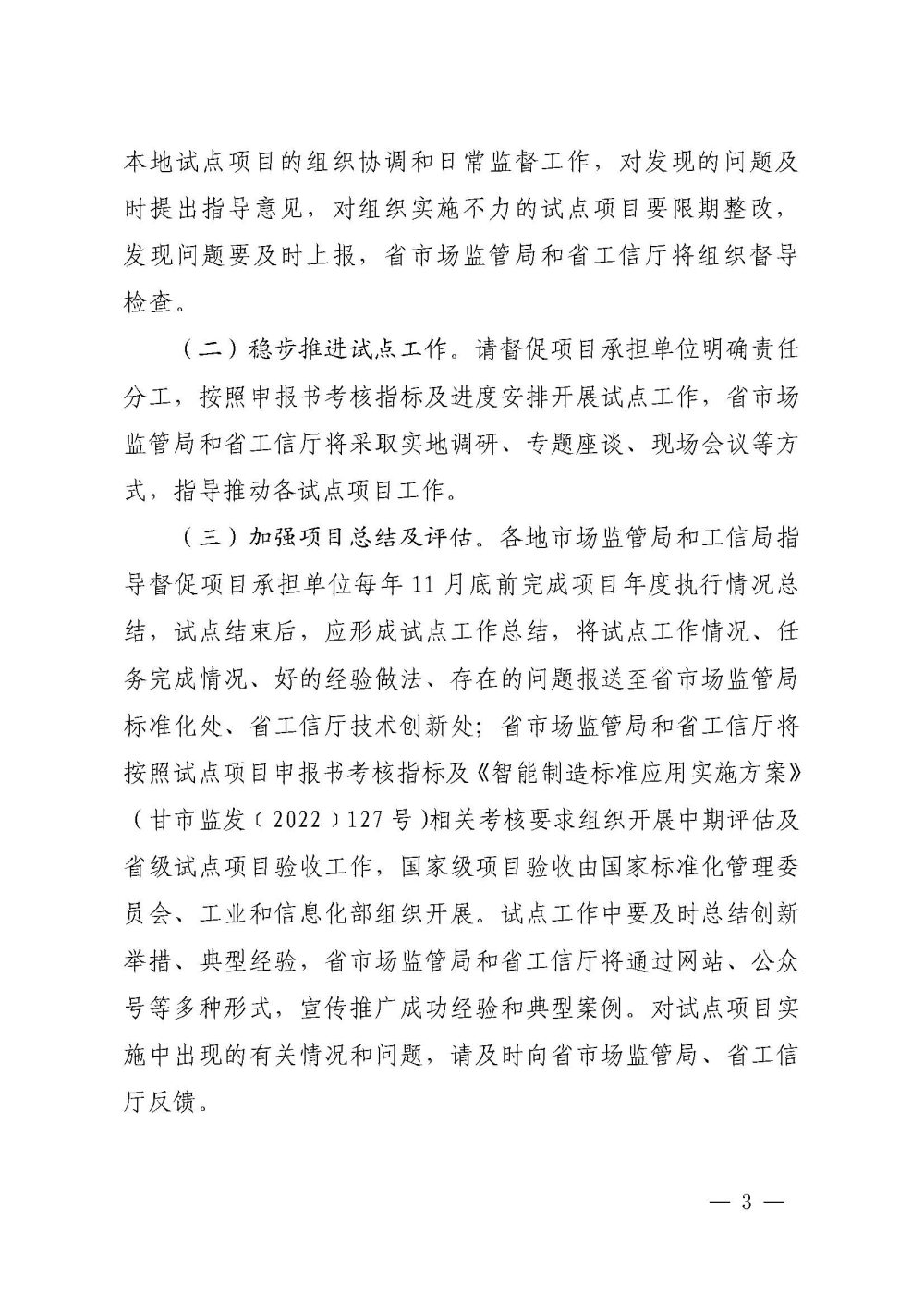 省級智能制造標準應用試點項目建設是為貫徹落實《國家標準化發展綱要》《“十四五”智能制造發展規劃》《甘肅省貫徹落實〈國家標準化發展綱要〉的實施意見》等相關部署,圍繞我省強工業行動重點任務,推動我省制造業企業運用標準化方式組織生產、經營、管理和服務,促進企業在轉型升級、提質增效中發揮標準支撐引領作用。