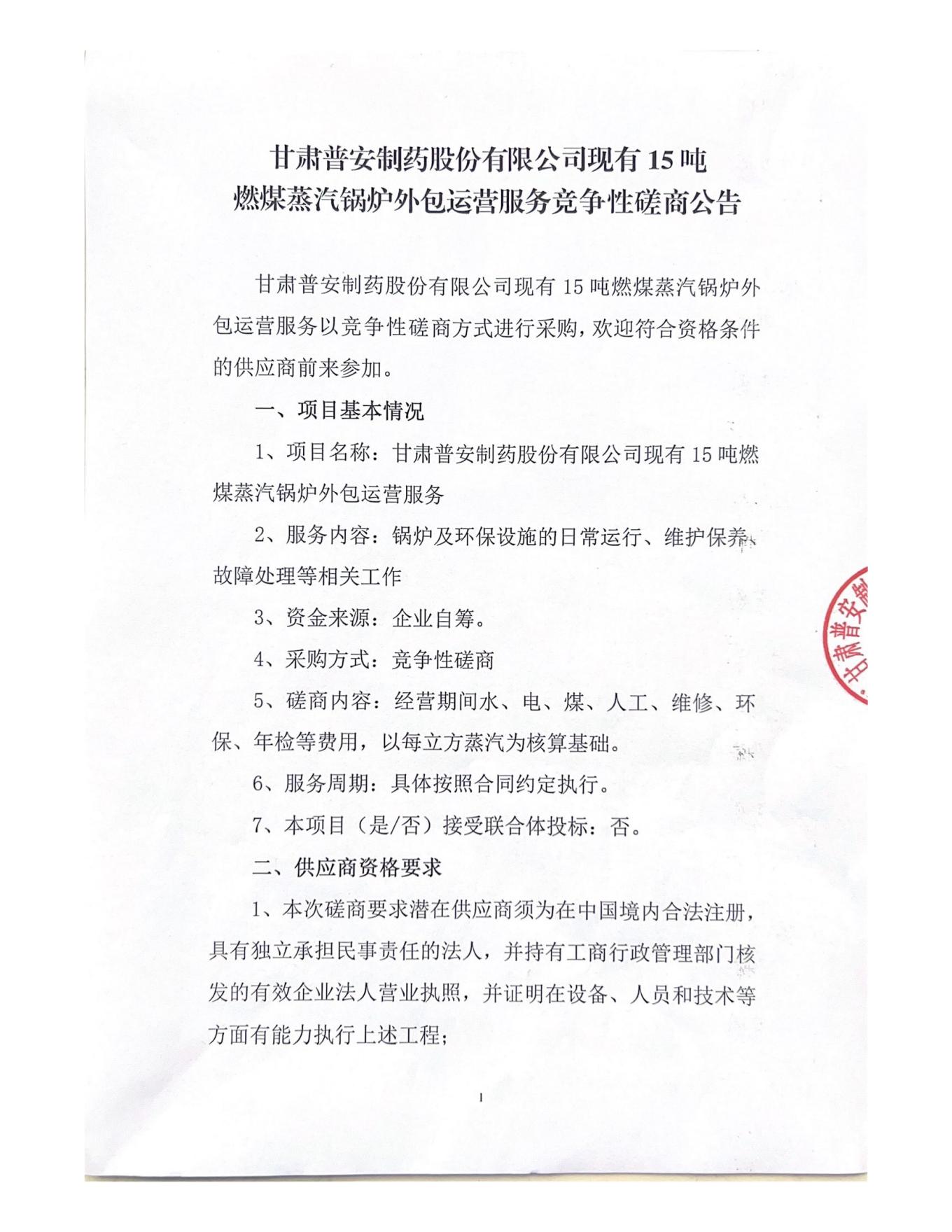 甘肅普安制藥股份有限公司現有15噸燃煤蒸汽鍋爐外包運營服務競爭性磋商公告