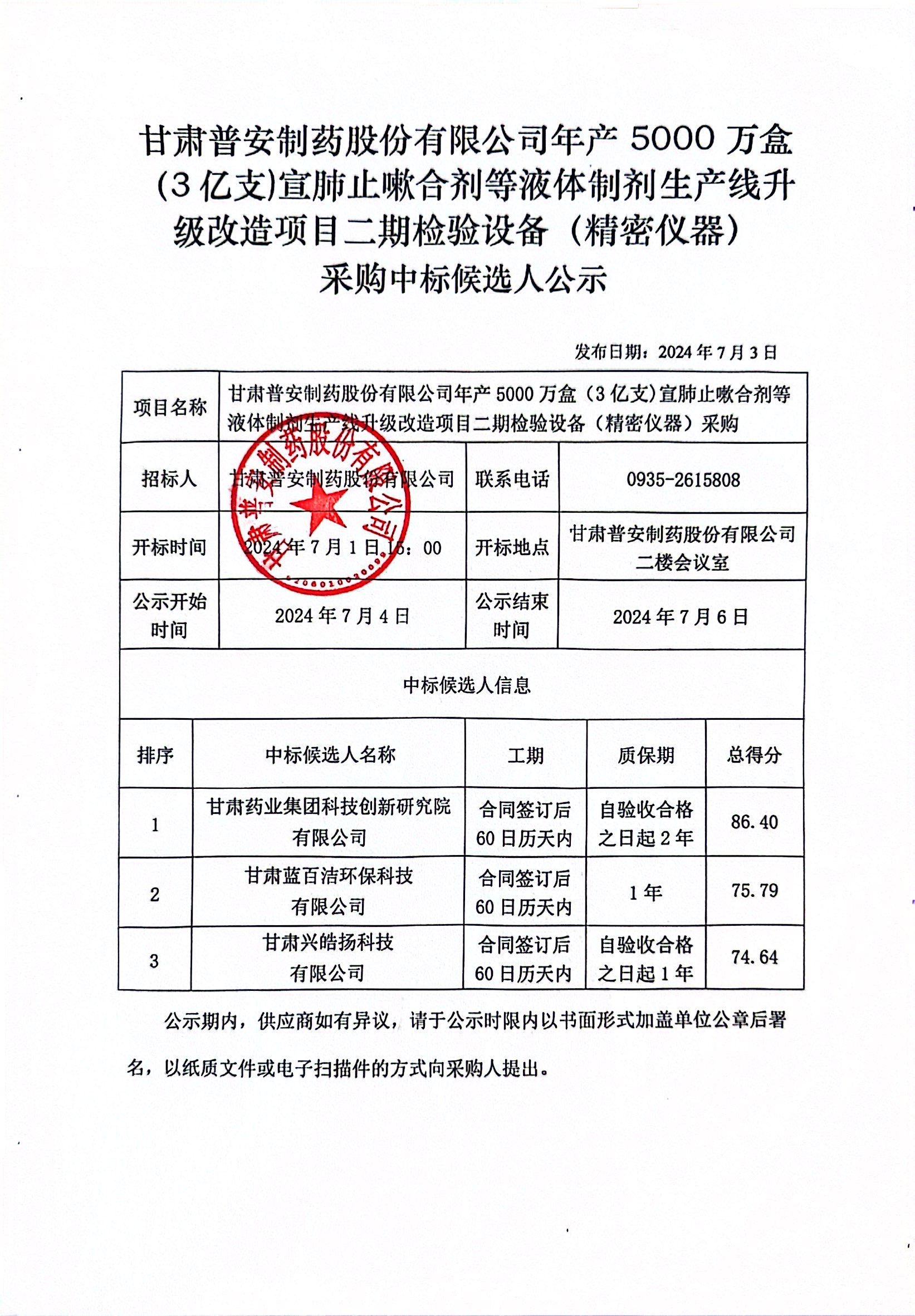 甘肅普安制藥股份有限公司年產(chǎn)5000萬盒(3億支)宣肺止嗽合劑等液體制劑生產(chǎn)線升級改造項目二期檢驗設(shè)備(精密儀器)采購中標(biāo)候選人公示
