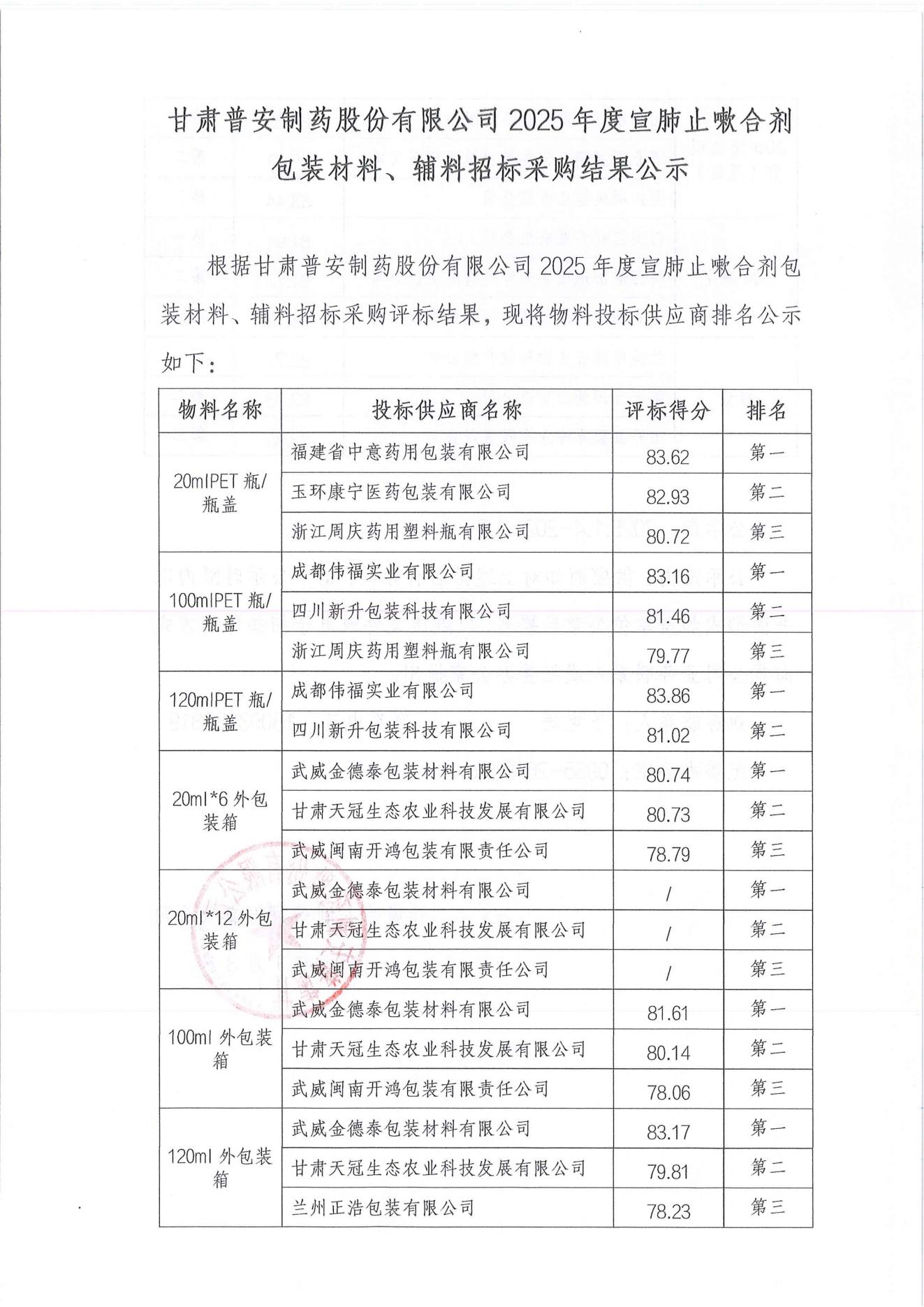 甘肅普安制藥股份有限公司2025年度宣肺止嗽合劑包裝材料、輔料招標采購結果公示