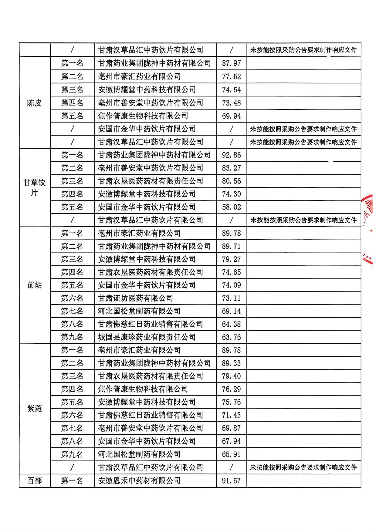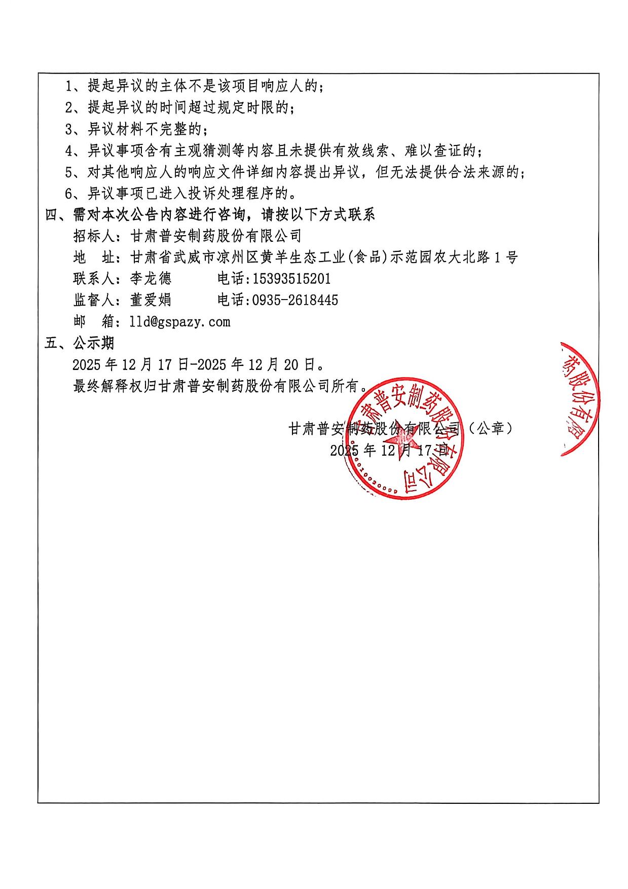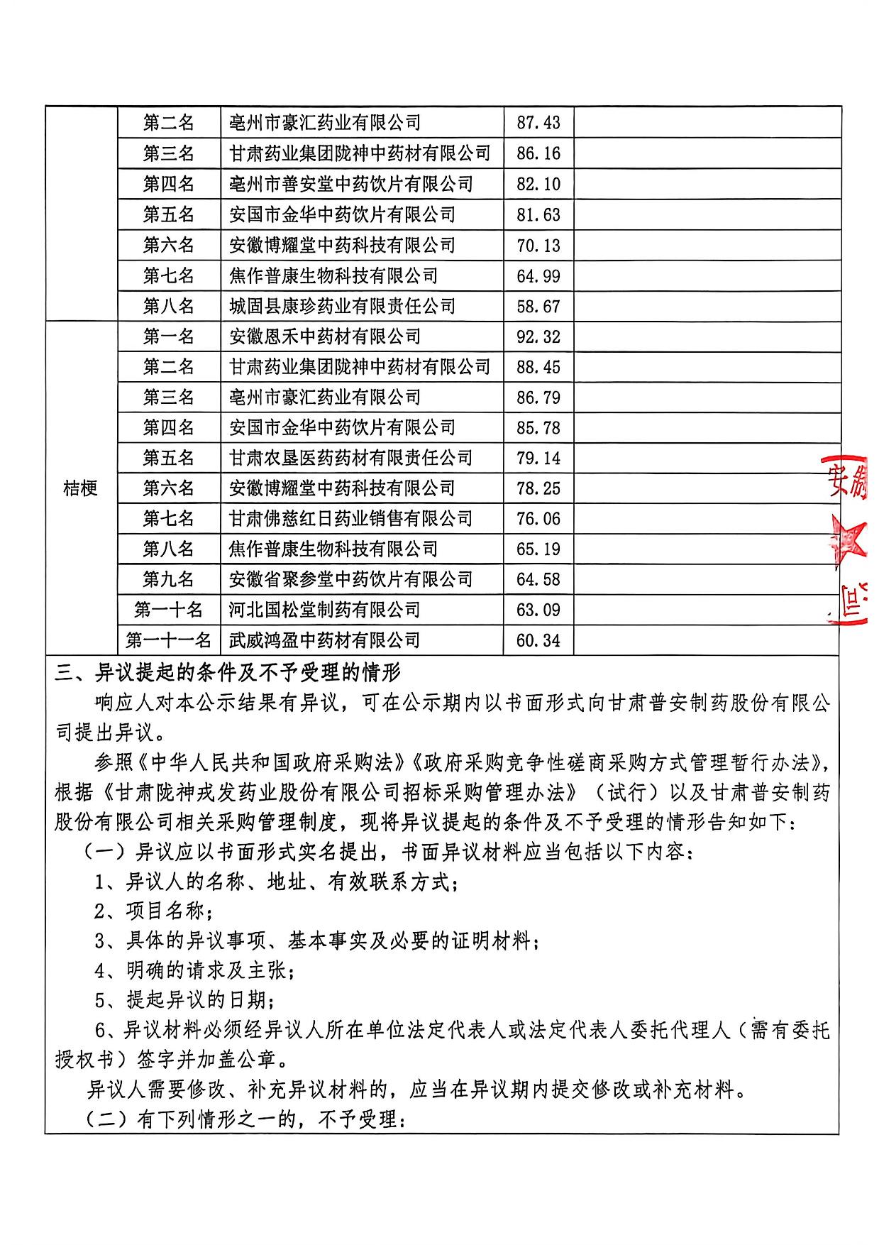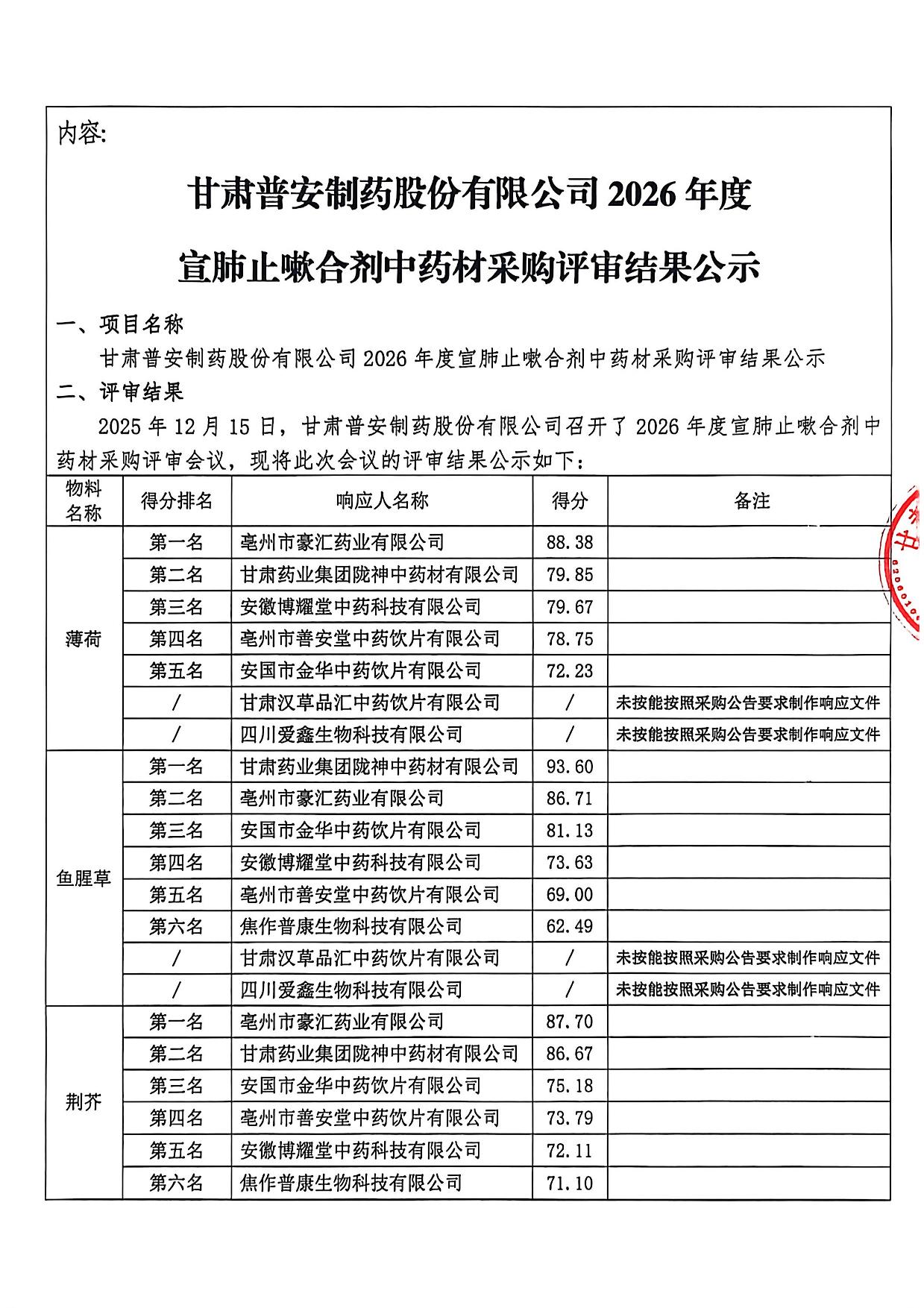 甘肅普安制藥股份有限公司2026年度宣肺止嗽合劑中藥材采購評(píng)審結(jié)果公示