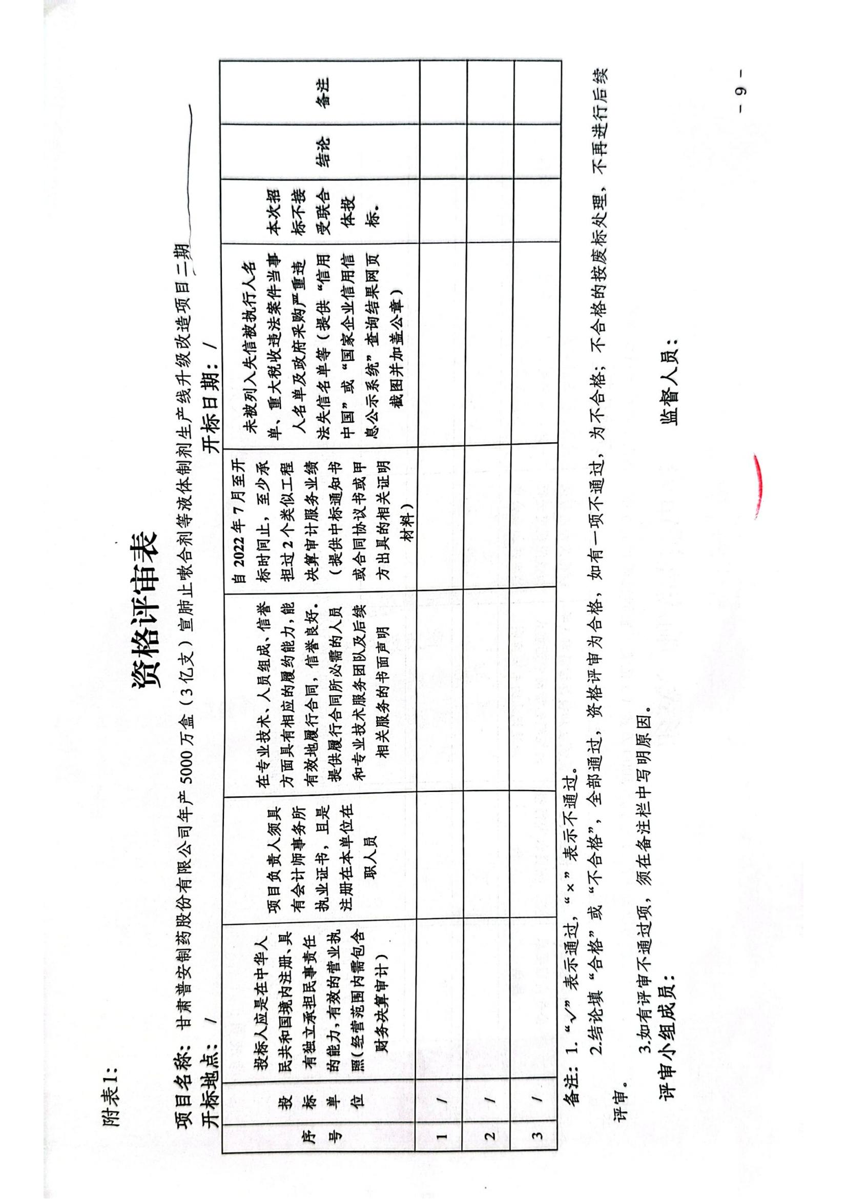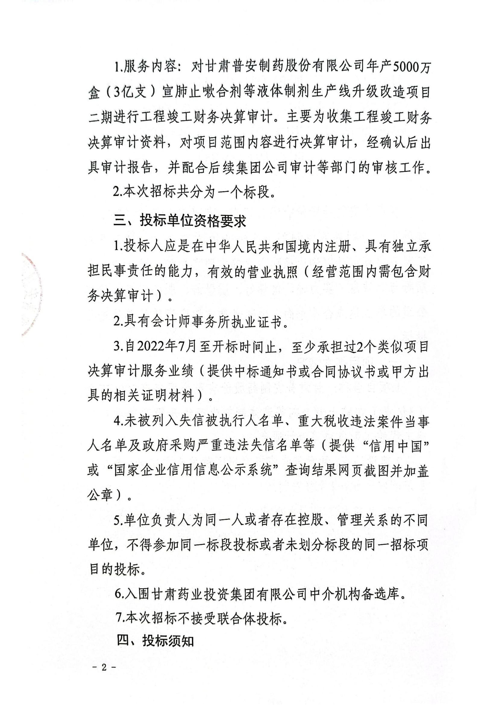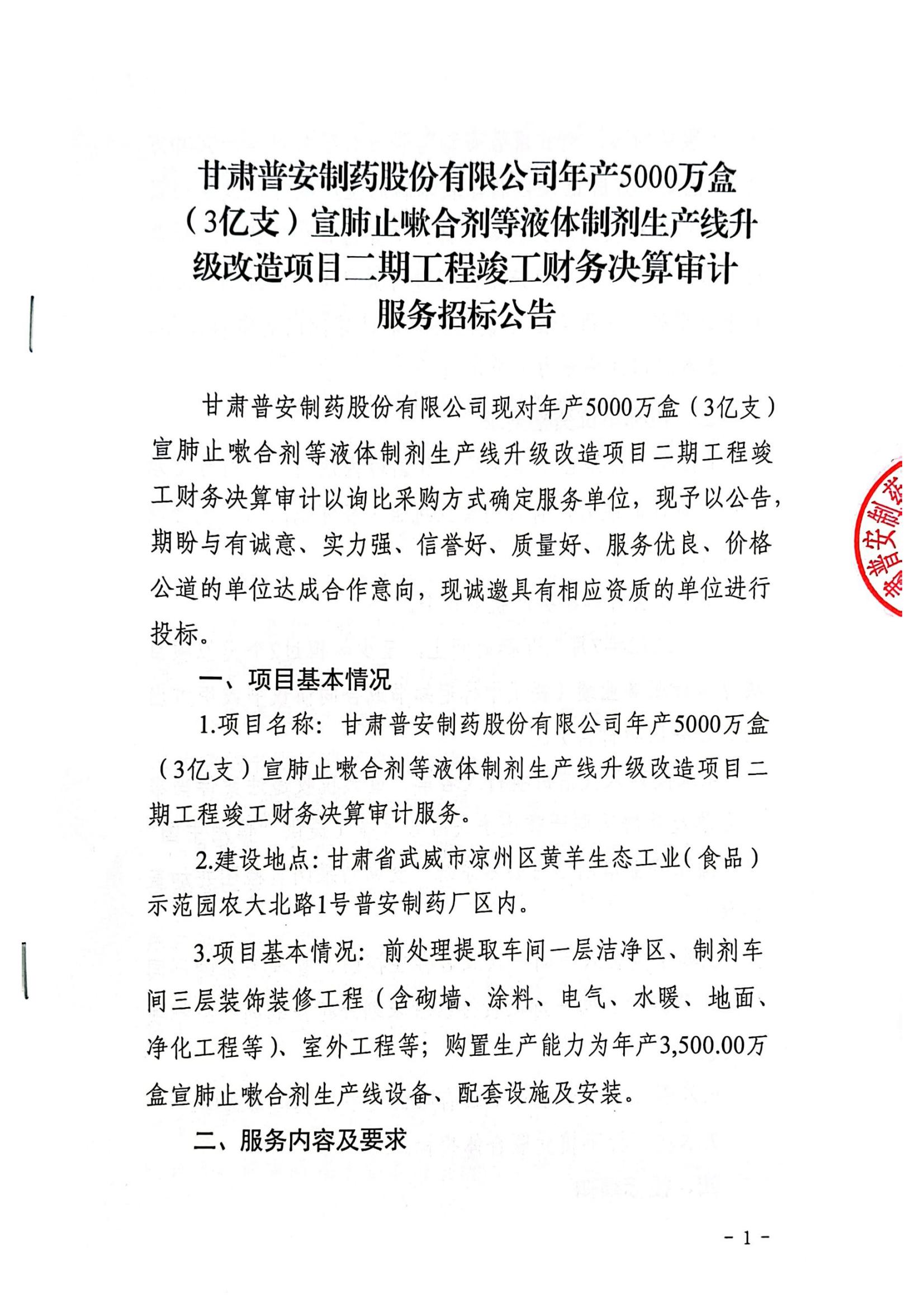 甘肅普安制藥股份有限公司年產(chǎn)5000萬盒宣肺止嗽合劑等液體制劑生產(chǎn)線升級改造項目二期竣工決算審計服務(wù)招標公告